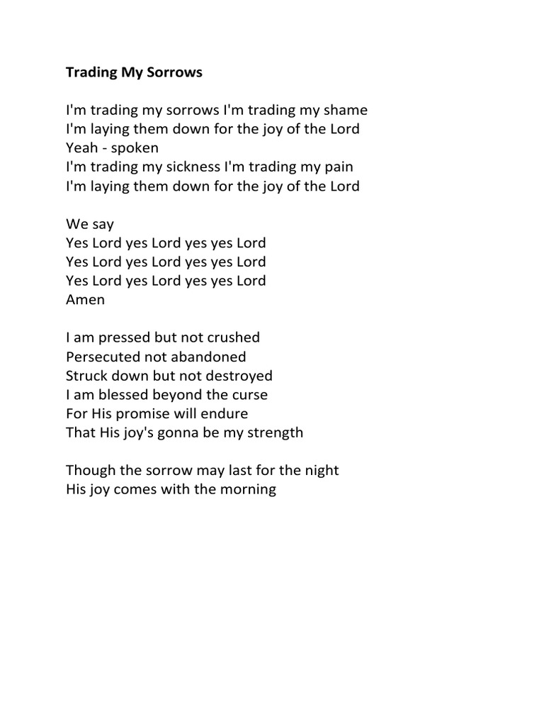 Im Trading My Sorrows Im Trading My Shame Im Laying Them Down For The Joy Of The Lord Im Trading My Sickness Im Trading My Pain Im Laying Them Down For The Joy Of The Lord. Im trading my sorrows Im trading my shame Im laying them down for the joy of the Lord. Though the sorrow may last for the night.